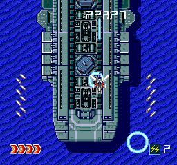 Four weapons that must be chosen at start of the stage. Barely any powerups and they're hard to collect because they float near the top of the screen. Four blocks of health help, but this is still a tough game. The worst feature is a gun that points the direction you are moving to, making it hard to hit enemies, ironically. If not for that I'd rank this higher.