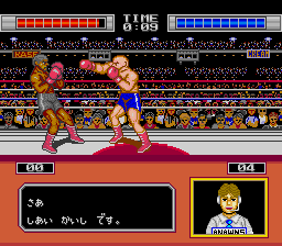 It's got two distinct modes - a beat 'em up section like Kung-Fu Master, followed by a boxing match. Both are sidescrollers, and can be easily cheesed. In the beat 'em up sections you can crouch to deliver low kicks, just like in Kung-Fu Master (Kung Fu on the NES), and in the ring you can simply mash II to deliver a rapid series of long jabs. In both cases your opponents can't reach you so you'll easily defeat all comers. Outside of the ring you can punch, kick, and jump, but you can't jump and attack, so it's only good for avoiding projectiles. The controls are horribly laggy and stiff. It feels like an early 80's arcade game. Inside the ring is a little better, with three kinds of punches, although only one is worth using. You have almost no lateral movement, so there's no point in trying to walk.
