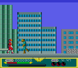 Begins as a standard Kung Fu clone. Enemies spawn in from the left or right and you only have a punch to take them down. Nearly all go down in one hit and they barrel towards you so the entire gameplay loop is timing your strokes to hot them without taking damage yourself. You can gain health and a Power Rangers power up that gives you an improved weapon. There are three - a sword, gun, and boomerang. The sword has a wide overhead arch, making it great for taking out flying and jumping enemies. With it, the game feels like Shinobi. The gun turns the game into Rolling Thunder. And the boomerang is an abomination that must be avoided at all costs. Taking damage will remove your current powerup but pickups are plentiful, so the game is quite easy. I have three major complaints - slow movement, laggy controls, and grounded gameplay. Enemies move much faster than you do, so progress is best made by slowly inching along to take them out individually. Laggy controls eat inputs and force you to be deliberate in all of your choices. And you can only punch while jumping, regardless of your power up, which rewards grounded gameplay. Twitch gameplay this is not.