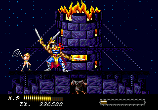 It's Ghouls 'n Ghosts starring a warrior lady instead of a knight. A guy is kidnapped and you're off to rescue the dude in distress. Pretty generic, but the fantasy setting is always good. Static cutscenes between levels tell the brief story.