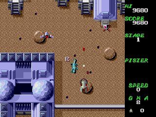 Uses the laser plus bomb mechanic from Xevious, but you use the bomb so rarely that I forgot it was there half the time. Holding two buttons is never fun. Huge hitbox. Bizarre powerup system where pickups all look the same and grant random abilities. Unpredictable and annoying.
