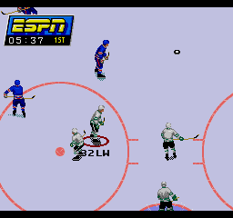 Tons of video on menus and before games. By detault oyu also get a video after every big check and score during gameplay. This results in a 20-30 second break in the action that absolutely destroys the flow of the game. Thankfully, this can be turned off. Movement is slow but the arena is large. No performance improvement over the Genesis version. Unfortunately the AI is bad. Opponents mostly stay away from you, at least on the beginner difficulty. Your teammates stand around and don't do much. Opponents skate around forever. I felt like I never had possession. The only way to dispossess is to check but the opponent recovers and picks up the puck before you can. Bad hit detection. Pass and shoot are quick. No long animations here. Passing works well. Extra button for a flip on offense and a poke on defense. Seem unnecessary.