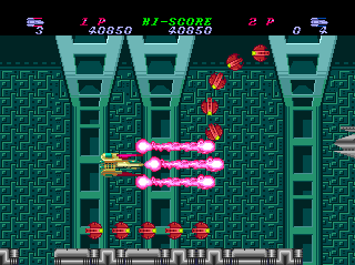 Big upgrade from the Genesis version. The slowdown is gone, movement is much faster, and the large sprite is less of an issue. Overall it plays well and can be fun at times. More on that later. Four main weapons (up/down, back, forward, and X) can be cycled through at will.