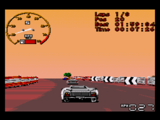 Jaguar is a rich Brit's car so the theme doesn't appeal to me, but the menu music and allowing you to pick a song from a car radio before each race gives it some excellent presentation. It's just a shame that the stuffy artwork makes it laughable. Also, only one drivable car is pretty lame.