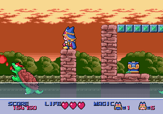 Plays a lot like a Wonderboy game. You've got a tall jump and you kill enemies by licking them with your really long tongue. Enemies follow predictable patterns and die in one hit, but so do you, which makes the game very difficult. Very slow movement, again, like the Wonderboy games. The platforming is weird because many, if not most of the platforms are made of collectible pieces which act as the currency in this game. You have to strike a balance between collecting this and using the platforms for movement. The reason for collecting this currency is to purchase power-ups between levels. You can enable these powers from the pause menu during gameplay and they give you projectile and other abilities. The game feels like a collectathon and it doesn't feel very good. And Mario games all you have to do is touch the coins and in Castlevania you use your weapon to hit those candles. Both mechanics feel nice but in this case you have to lick them with your tongue and doing so stops all your momentum, even if you're jumping. So the whole experience is slow and then still tilted and then slow and still do it again. It's okay, but just doesn't feel great.