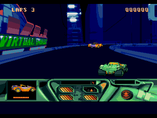 This is one of the least colorful games I've seen. 90% of the screen is jet black while the remaining 10% is a single color. For example, the second race takes place in an underwater tube, so the contrasting color is dark, dark blue. The car sprites aren't too bad, but don't make up for the terrible FMV video playing in the background.