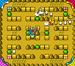 Terrible Bomberman clone. Movement feels fine, but everything else about the gameplay sucks. The objective is convoluted - collect eggs, wait for them to hatch and hope that the hatched chicks return to your base. Side objectives are to pick up powerups and to knock out opponents to separate them from chicks and their own power ups. However, the frequency of these pickups causes the game to quickly devolve into chaos as one of two opponents gather more and more strength until they are barreling around the screen, keeping you perpetually stun locked. If you somehow keep your head above water you survive it even win a round but doing so is highly unlikely. Apparently it was not released as a retail product, but was rather bundled on a CD with a magazine.
