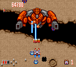 Nice speed, five satisfying weapons and crazy amounts of powerups. This is a near-perfect vertical shooter save for one problem - the insane difficulty. Dying brings you back immediately which is more a curse than a blessing because it's nearly impossible to stay alive without full power. Thankfully you've got four units of health but health pickups are rare. Easily one of the most challenging shooters of the era. Difficulty settings would've been nice.