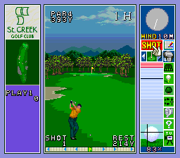 the redraw issue is a major bummer, but the actual look of the game is far more attractive than most of the realistic golf games. this one has bold colors, simple artwork without ugly polygons or dithered artwork, and a compact but readable UI.