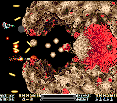 Some interesting ideas here, like the first stage which is an homage to the flying fortress third stage of R-Type, but in this case it's your mothership that's being attacked by enemies that you fight off.