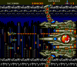 I'm tempted to score it higher, but the extreme difficulty holds it back. Movement is responsive but there are only two weapons with a couple of powerups, including up to two trailing options, ala Gradius. Powerups are few and far between though. It reminds me of Aero Blasters, with it's thin sprites that are hard to shoot with your equally narrow shots. Overall it feels just ok