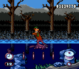 Just get to the end of the level. Follows DKC model of tons of optional collectables. Lots of blind jumps Easy to spot platforms Collectables include picnic baskets you can bounce off one before they disappear. These are arranged in a line or in a pattern and challenge is to collect them all. Repetitive use of the same picnic basket arrangements. Better than the standard "collect all keys before exiting" design of so many licensed titles.